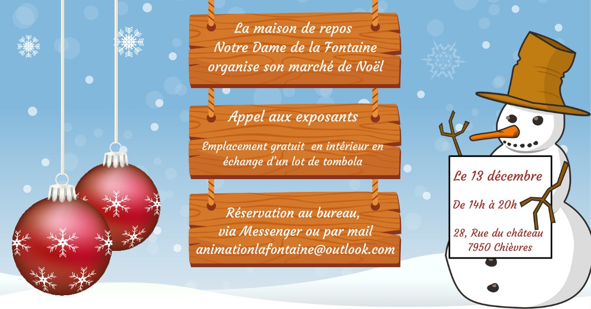 La Résidence Notre-Dame de la Fontaine vous donne rendez-vous le samedi 13 décembre de 14h00 à 20h00 pour son marché de Noël.